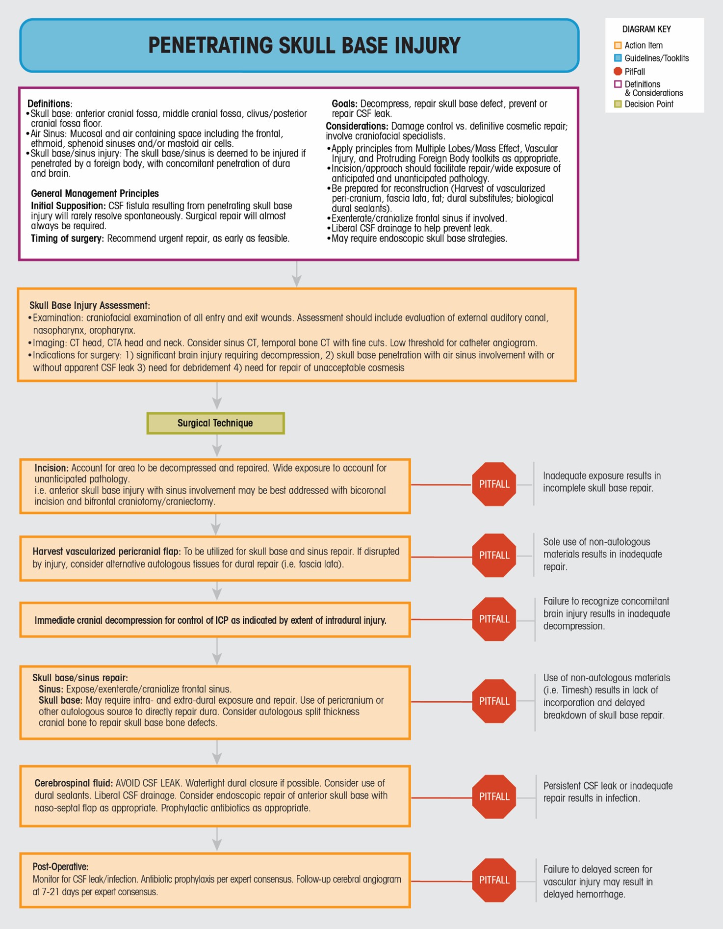 It is beyond the scope of this algorithm to address the specific technical nuances of individual skull base approaches and repair techniques. The following will address the main areas that should be considered during penetrating injury repair. The goals of surgery remain first and foremost cranial decompression and control of hemorrhage, followed by skull base repair and prevention of cerebrospinal fluid leak. Patient positioning and operative exposure should therefore account for the location of the skull base injury, and the possible need for cerebral decompression. Harvest of a large vascularized pericranial flap during exposure adds little time to the procedure and can facilitate adequate repair. Assuming adequate cranial decompression without rapid and malignant swelling, it is then necessary to approach the area of skull base disruption. Exenteration and cranialization of the frontal sinuses may be necessary if the anterior fossa is disrupted. Approach to orbital or ethmoidal penetrating injury may include an intra- and extra-dural exposure, and may also require endoscopic augmentation with naso-septal flap or other techniques